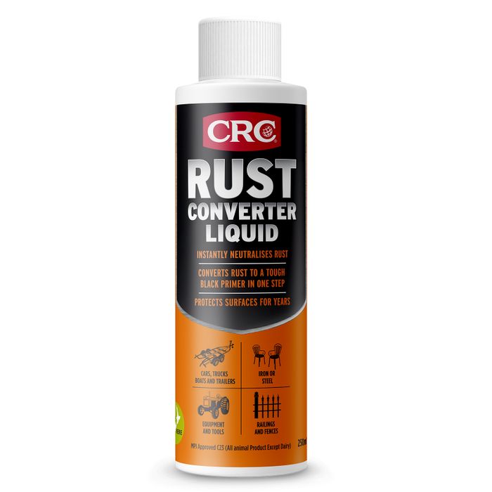 CRC Rust Converter is a unique fast drying coating formulated for treatment of lightly rusted or correctly prepared metal surfaces. CRC Rust Converter neutralises rust and converts it to a tough black primer in one easy step. It binds to the surface and provides a waterproof barrier by sealing out moisture and other outside elements for effective long-lasting rust protection. No more sandblasting, heavy scraping, or grinding.
