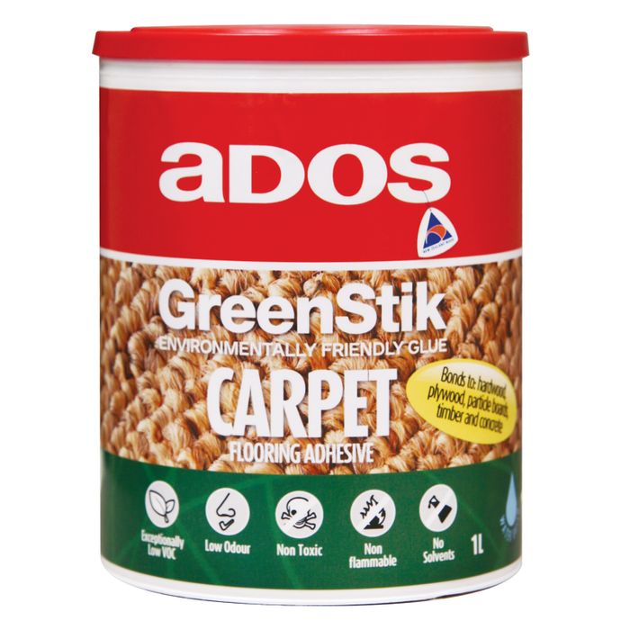 ADOS GreenStik Carpet Flooring Adhesive is a high viscosity, low slump product with long tack off formulated for use on all carpet types including foam backed carpets and foam rubber underlays. It provides superior adhesion to most flooring substrates such as hardwood, plywood, particle board, timber and concrete including unsealed timber, porous surfaces and surfaces with slight imperfections.